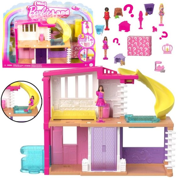 domek dla lalek Barbie, mini domek, dom, zjeżdżalnia, winda, basen, małe mebelki, figurki, figurka, box z niespodzianką, zwierzątko, zwierzak niespodzianka, pies, kot